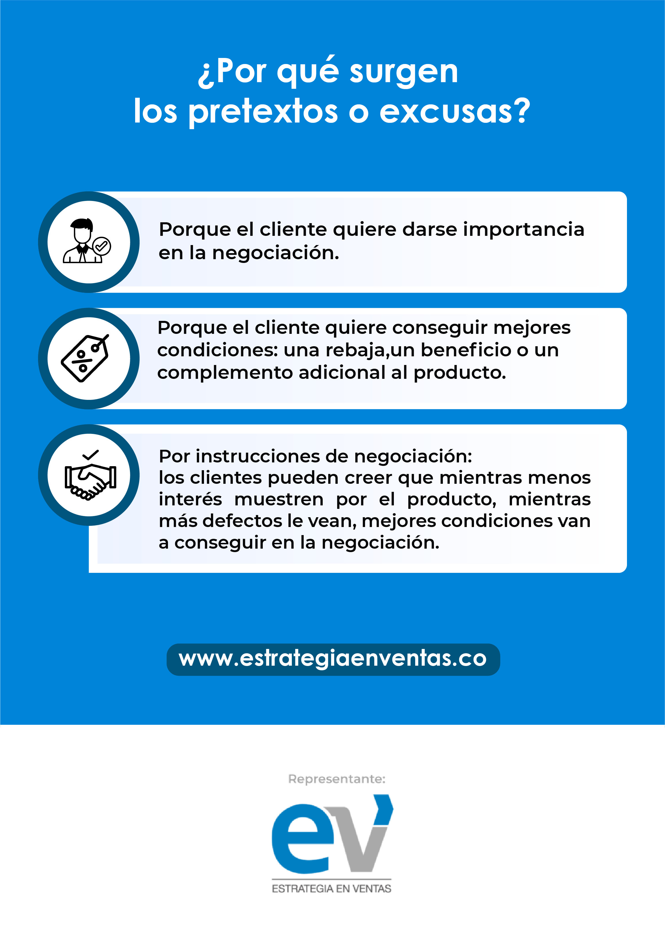 No todas las razones que el comprador expone como dificultades para tomar una decisión de compra son verdaderas objeciones; algunas son excusas o pretextos. Las objeciones y pretextos se diferencian en que la objeción es una razón real, verdadera, que impide que el cliente tome una decisión pero, a la vez, es una manifestación inequívoca de que el cliente está interesado en la propuesta.