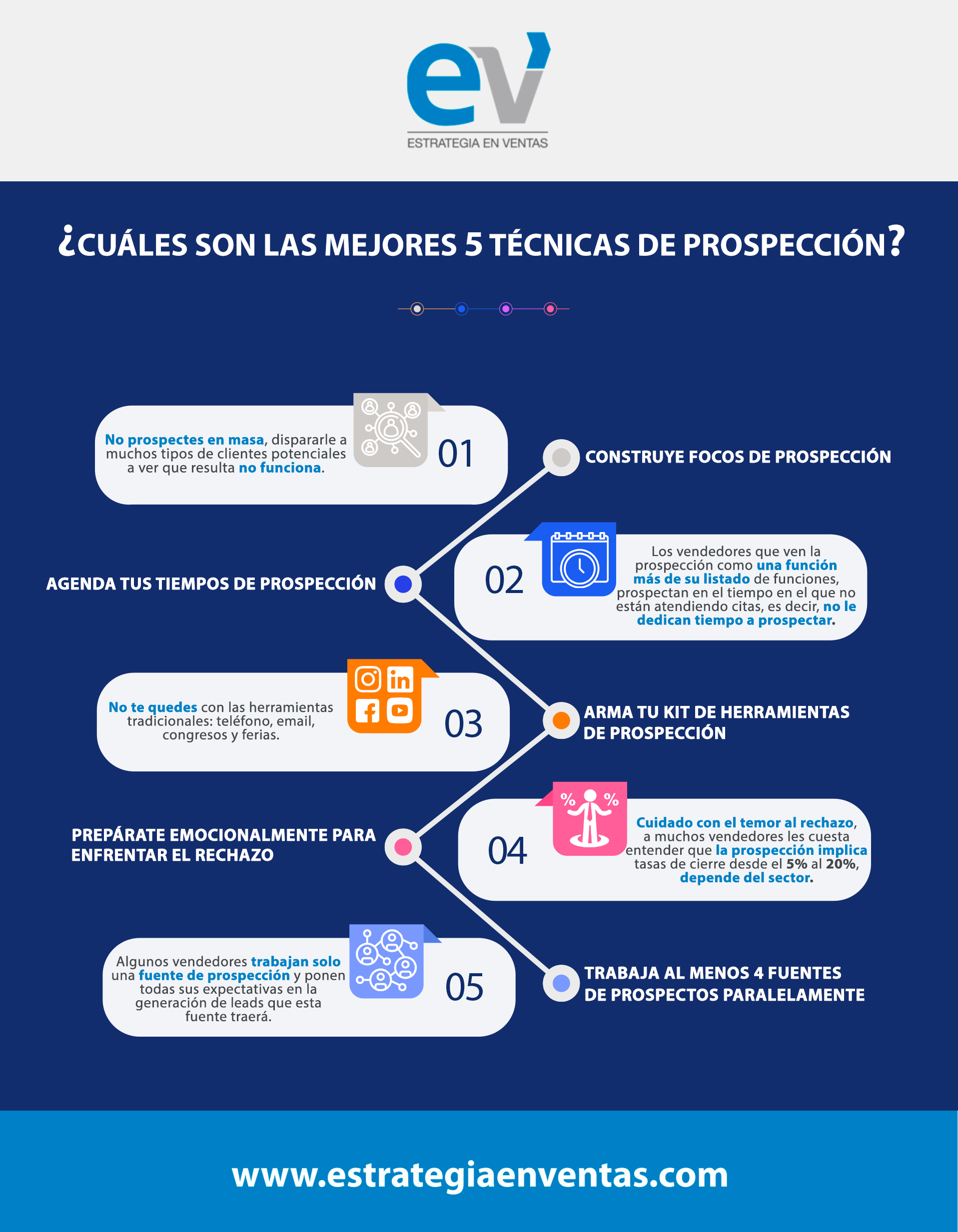 Prospectar, es decir, trabajar para conseguir nuevos clientes no tiene porqué ser tan difícil y sin embargo, es una actividad a la que muchos vendedores le temen o inclusive le huyen. Muchos hacen prospección pero pocos son los que realmente son efectivos y exitosos. Hablemos entonces de las cinco mejores técnicas que los vendedores podemos usar a la hora de prospectar :